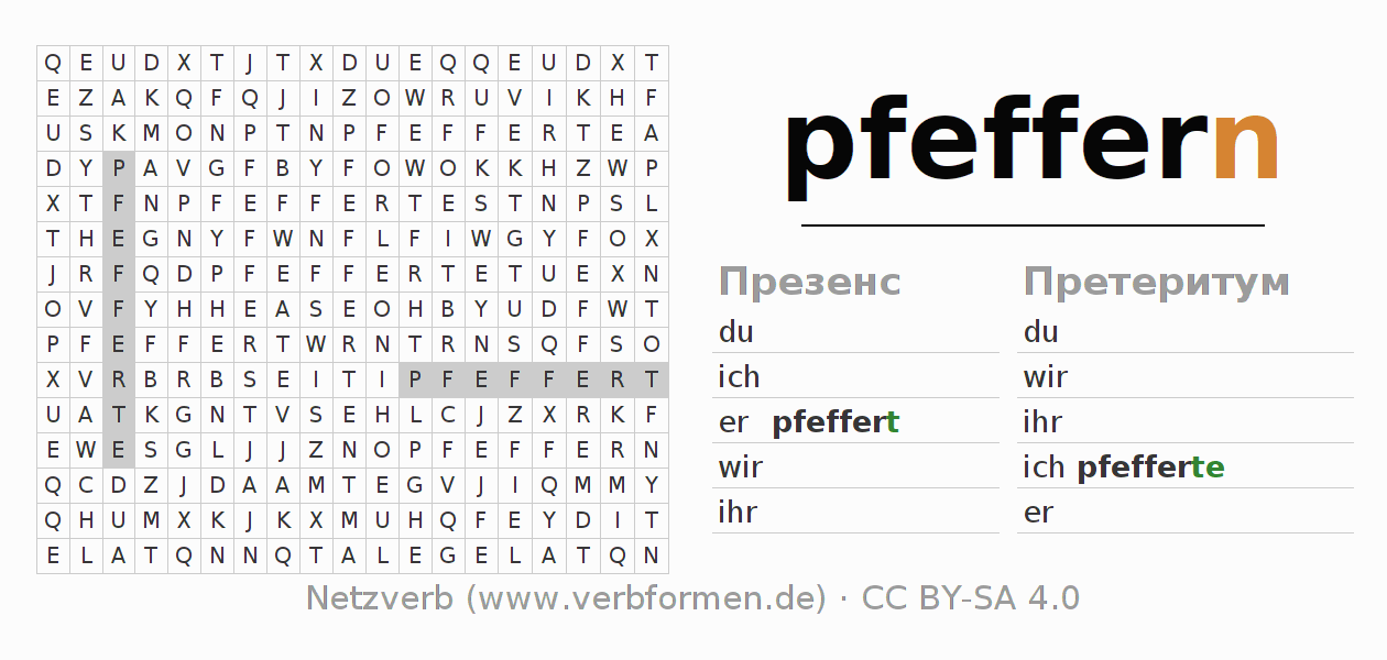 Рабочие материалы служат обучением спряжениям глагола pfeffern на уроке и при самообучении. Рабочие материалы могут быть свободно использованы в рамках лицензии CC BY-SA 4.0 в виде Открытых образовательных ресурсов(ООР) например могут быть бесплатно использованы на уроке. Для этого имеется много различных типов рабочих материалов для глагола pfeffern в наличии. Это таблицы спряжений, головоломки и игры. Весь учебный материал доступен бесплатно как файлы PDF, в виде изображений или как интерактивная версия браузера. В дополнение к задачам, имеются бесчисленные примеры для pfeffern а также помощь в использовании глаголов.