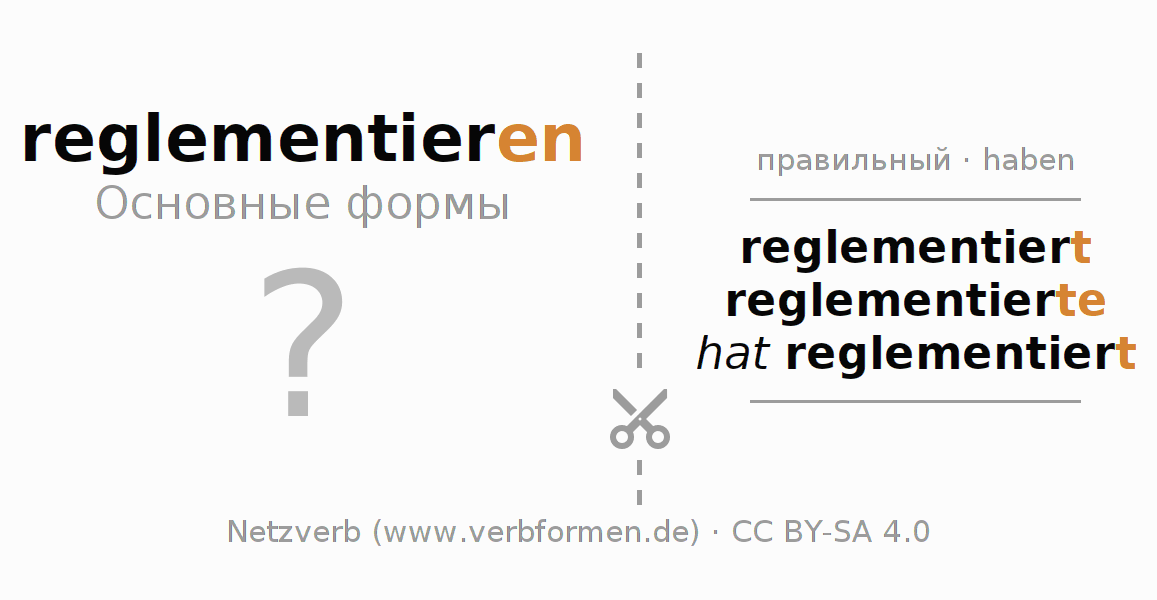 Глагольные таблицы, содержащие все формы глагола reglementieren, для наглядности объединены в одну общую таблицу.