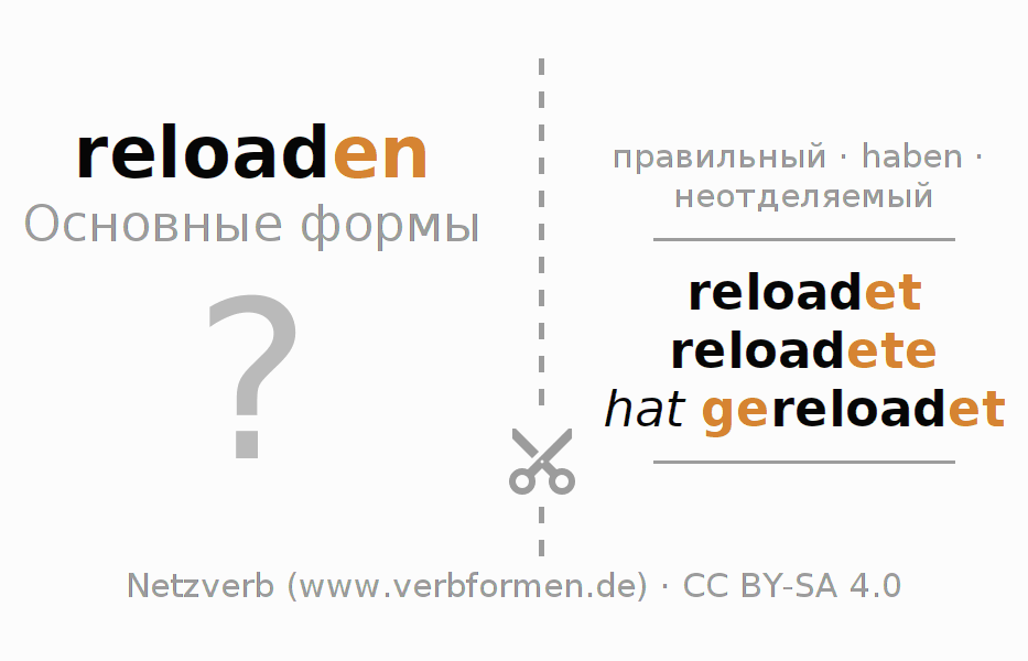 Глагольные таблицы, содержащие все формы глагола reloaden, для наглядности объединены в одну общую таблицу.