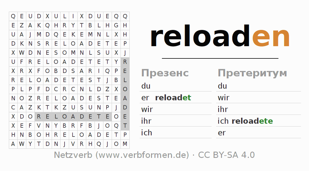 С помощью этих головоломок по поиску слов Вы можете подходящим для Вас способом изучать спряжение немецкого глагола reloaden.