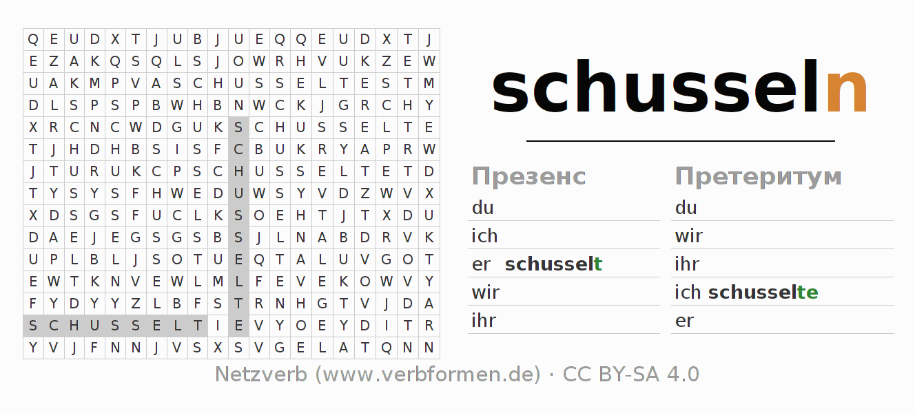 Рабочие материалы служат обучением спряжениям глагола schusseln на уроке и при самообучении. Рабочие материалы могут быть свободно использованы в рамках лицензии CC BY-SA 4.0 в виде Открытых образовательных ресурсов(ООР) например могут быть бесплатно использованы на уроке. Для этого имеется много различных типов рабочих материалов для глагола schusseln в наличии. Это таблицы спряжений, головоломки и игры. Весь учебный материал доступен бесплатно как файлы PDF, в виде изображений или как интерактивная версия браузера. В дополнение к задачам, имеются бесчисленные примеры для schusseln а также помощь в использовании глаголов.