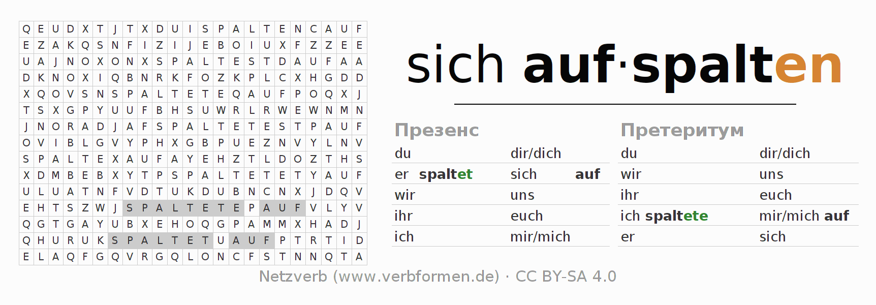 Рабочие материалы служат обучением спряжениям глагола aufspalten на уроке и при самообучении. Рабочие материалы могут быть свободно использованы в рамках лицензии CC BY-SA 4.0 в виде Открытых образовательных ресурсов(ООР) например могут быть бесплатно использованы на уроке. Для этого имеется много различных типов рабочих материалов для глагола sich aufspalten в наличии. Это таблицы спряжений, головоломки и игры. Весь учебный материал доступен бесплатно как файлы PDF, в виде изображений или как интерактивная версия браузера. В дополнение к задачам, имеются бесчисленные примеры для aufspalten а также помощь в использовании глаголов.