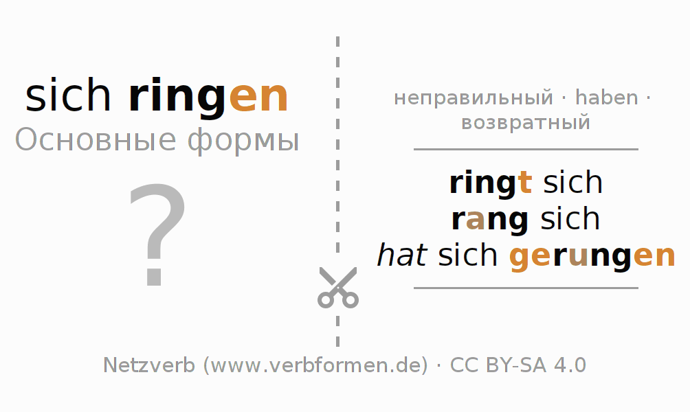Глагольные таблицы, содержащие все формы глагола sich ringen, для наглядности объединены в одну общую таблицу.