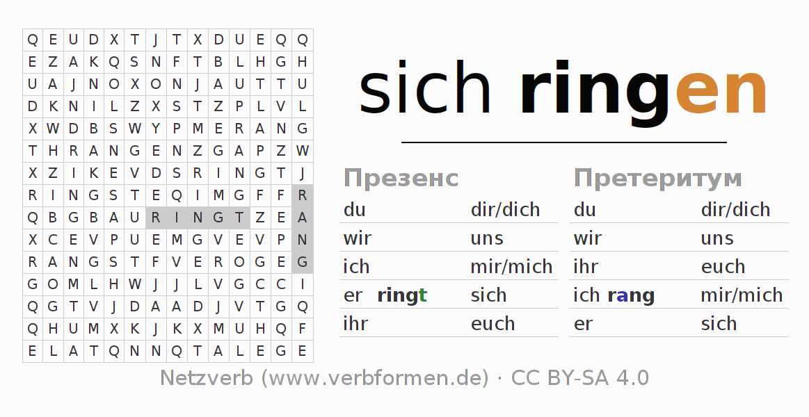Рабочие материалы служат обучением спряжениям глагола ringen на уроке и при самообучении. Рабочие материалы могут быть свободно использованы в рамках лицензии CC BY-SA 4.0 в виде Открытых образовательных ресурсов(ООР) например могут быть бесплатно использованы на уроке. Для этого имеется много различных типов рабочих материалов для глагола sich ringen в наличии. Это таблицы спряжений, головоломки и игры. Весь учебный материал доступен бесплатно как файлы PDF, в виде изображений или как интерактивная версия браузера. В дополнение к задачам, имеются бесчисленные примеры для ringen а также помощь в использовании глаголов.