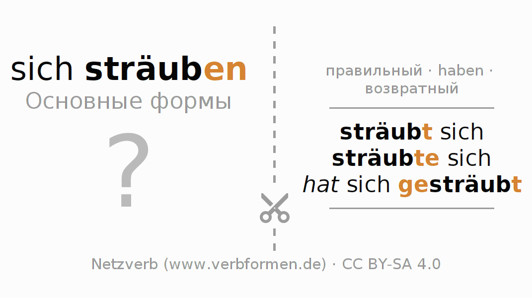 Рабочие материалы служат обучением спряжениям глагола sträuben на уроке и при самообучении. Рабочие материалы могут быть свободно использованы в рамках лицензии CC BY-SA 4.0 в виде Открытых образовательных ресурсов(ООР) например могут быть бесплатно использованы на уроке. Для этого имеется много различных типов рабочих материалов для глагола sich sträuben в наличии. Это таблицы спряжений, головоломки и игры. Весь учебный материал доступен бесплатно как файлы PDF, в виде изображений или как интерактивная версия браузера. В дополнение к задачам, имеются бесчисленные примеры для sträuben а также помощь в использовании глаголов.
