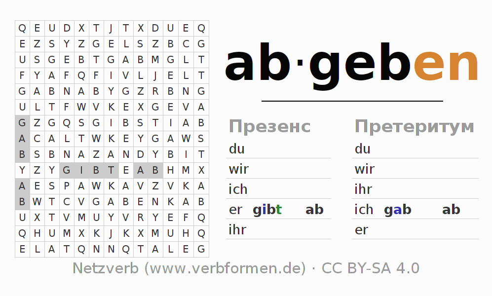 Инструкция: образовать формы глагола abgeben и найти их в головоломке, либо распознать изменённую форму abgeben в буквенном винегрете и соотнести ее с правильной формой глагола. Умлауты и -ß- транслитерируются соответственно как -oe-, -ae-, -ue- и -ss-.Ответ находится в конце страницы.