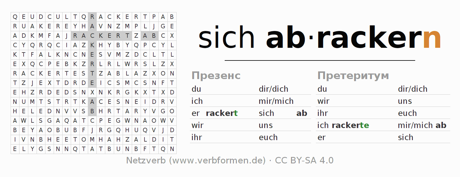 Инструкция: образовать формы глагола sich abrackern и найти их в головоломке, либо распознать изменённую форму sich abrackern в буквенном винегрете и соотнести ее с правильной формой глагола. Умлауты и -ß- транслитерируются соответственно как -oe-, -ae-, -ue- и -ss-.Ответ находится в конце страницы.