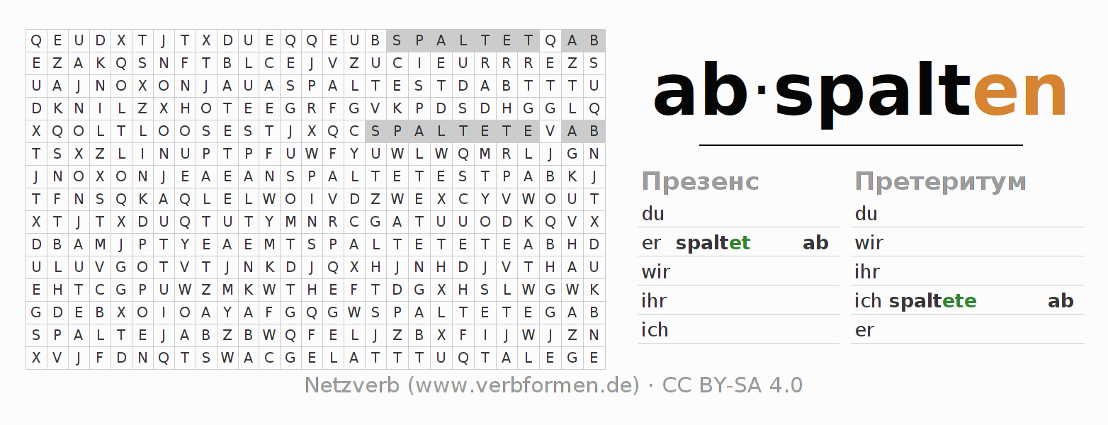 Инструкция: образовать формы глагола abspalten и найти их в головоломке, либо распознать изменённую форму abspalten в буквенном винегрете и соотнести ее с правильной формой глагола. Умлауты и -ß- транслитерируются соответственно как -oe-, -ae-, -ue- и -ss-.Ответ находится в конце страницы.