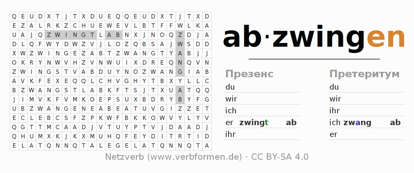 Инструкция: образовать формы глагола abzwingen и найти их в головоломке, либо распознать изменённую форму abzwingen в буквенном винегрете и соотнести ее с правильной формой глагола. Умлауты и -ß- транслитерируются соответственно как -oe-, -ae-, -ue- и -ss-.Ответ находится в конце страницы.