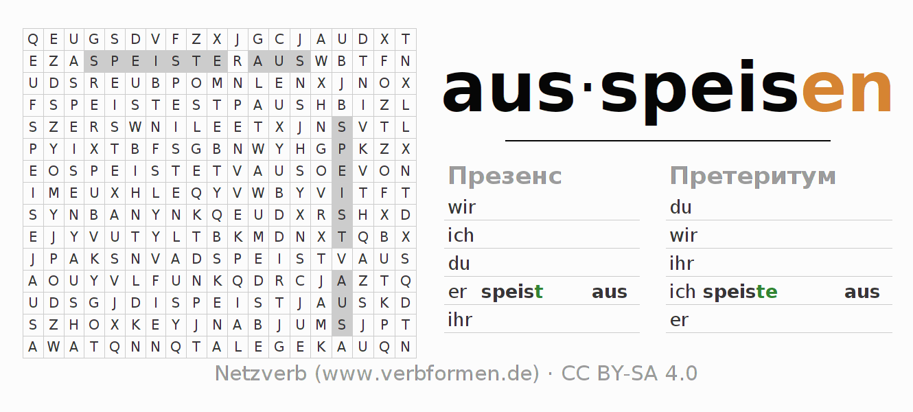 Инструкция: образовать формы глагола ausspeisen и найти их в головоломке, либо распознать изменённую форму ausspeisen в буквенном винегрете и соотнести ее с правильной формой глагола. Умлауты и -ß- транслитерируются соответственно как -oe-, -ae-, -ue- и -ss-.Ответ находится в конце страницы.