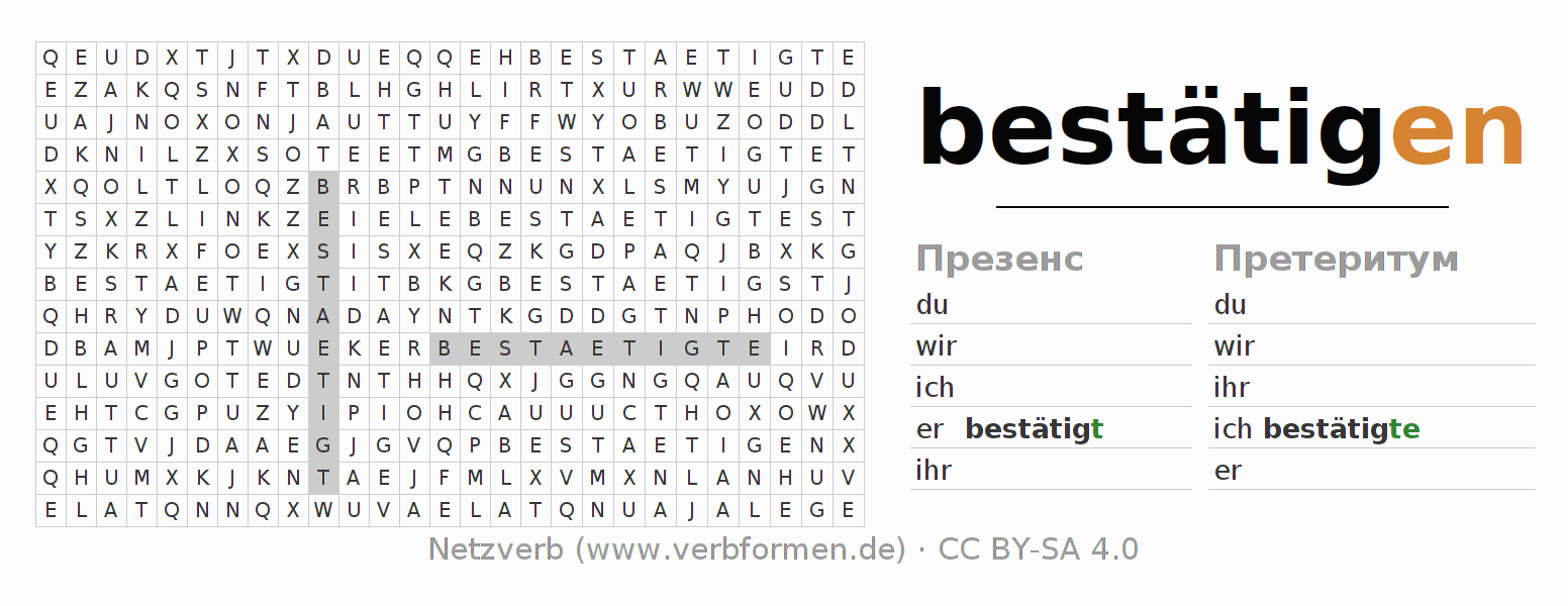 Инструкция: образовать формы глагола bestätigen и найти их в головоломке, либо распознать изменённую форму bestätigen в буквенном винегрете и соотнести ее с правильной формой глагола. Умлауты и -ß- транслитерируются соответственно как -oe-, -ae-, -ue- и -ss-.Ответ находится в конце страницы.