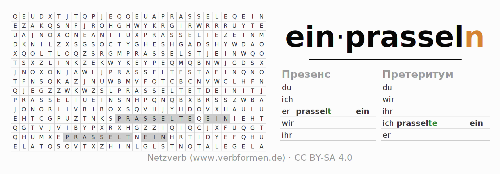 Инструкция: образовать формы глагола einprasseln и найти их в головоломке, либо распознать изменённую форму einprasseln в буквенном винегрете и соотнести ее с правильной формой глагола. Умлауты и -ß- транслитерируются соответственно как -oe-, -ae-, -ue- и -ss-.Ответ находится в конце страницы.