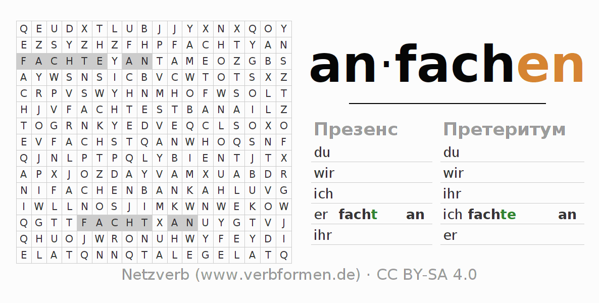Инструкция: образовать формы глагола anfachen и найти их в головоломке, либо распознать изменённую форму anfachen в буквенном винегрете и соотнести ее с правильной формой глагола. Умлауты и -ß- транслитерируются соответственно как -oe-, -ae-, -ue- и -ss-.Ответ находится в конце страницы.