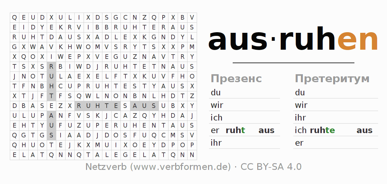 Инструкция: образовать формы глагола ausruhen и найти их в головоломке, либо распознать изменённую форму ausruhen в буквенном винегрете и соотнести ее с правильной формой глагола. Умлауты и -ß- транслитерируются соответственно как -oe-, -ae-, -ue- и -ss-.Ответ находится в конце страницы.