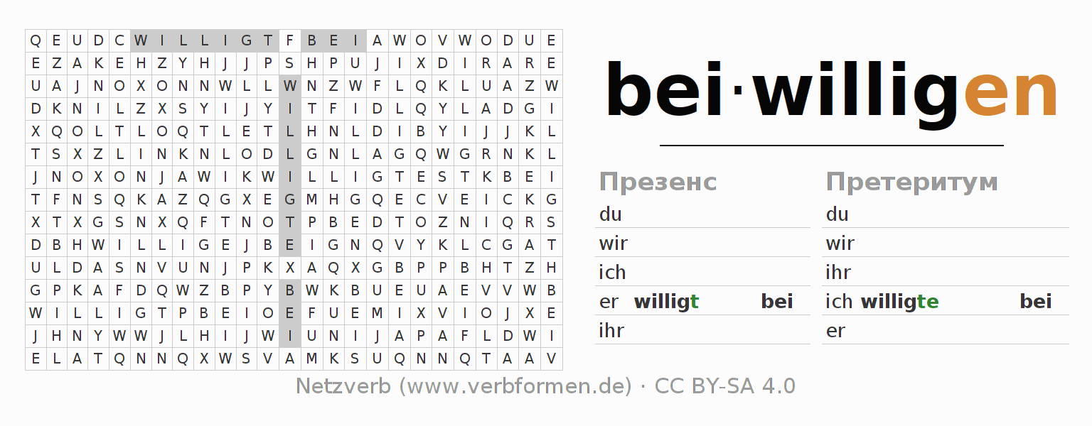 Инструкция: образовать формы глагола beiwilligen и найти их в головоломке, либо распознать изменённую форму beiwilligen в буквенном винегрете и соотнести ее с правильной формой глагола. Умлауты и -ß- транслитерируются соответственно как -oe-, -ae-, -ue- и -ss-.Ответ находится в конце страницы.