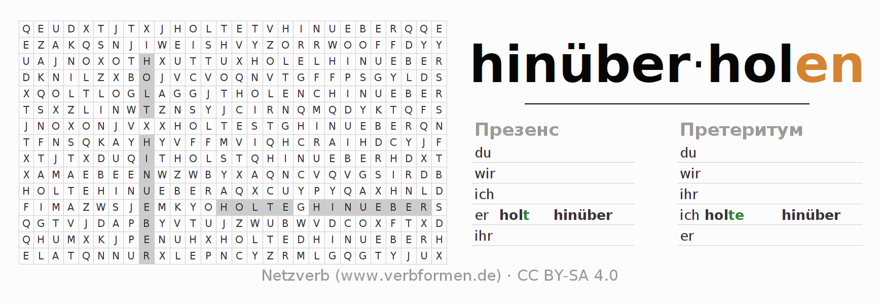 Инструкция: образовать формы глагола hinüberholen и найти их в головоломке, либо распознать изменённую форму hinüberholen в буквенном винегрете и соотнести ее с правильной формой глагола. Умлауты и -ß- транслитерируются соответственно как -oe-, -ae-, -ue- и -ss-.Ответ находится в конце страницы.