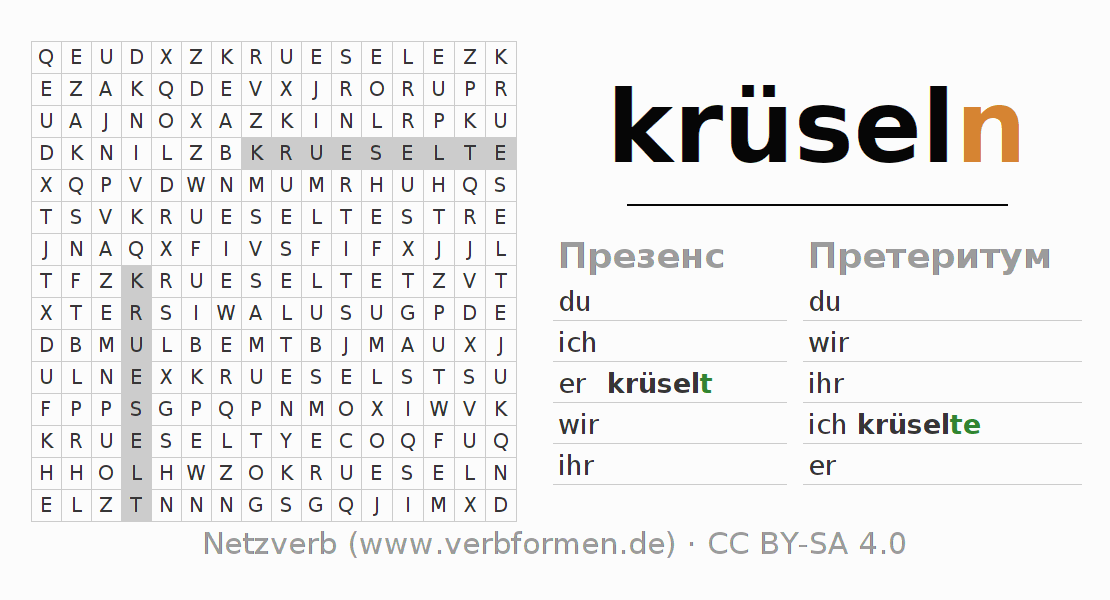 Инструкция: образовать формы глагола krüseln и найти их в головоломке, либо распознать изменённую форму krüseln в буквенном винегрете и соотнести ее с правильной формой глагола. Умлауты и -ß- транслитерируются соответственно как -oe-, -ae-, -ue- и -ss-.Ответ находится в конце страницы.