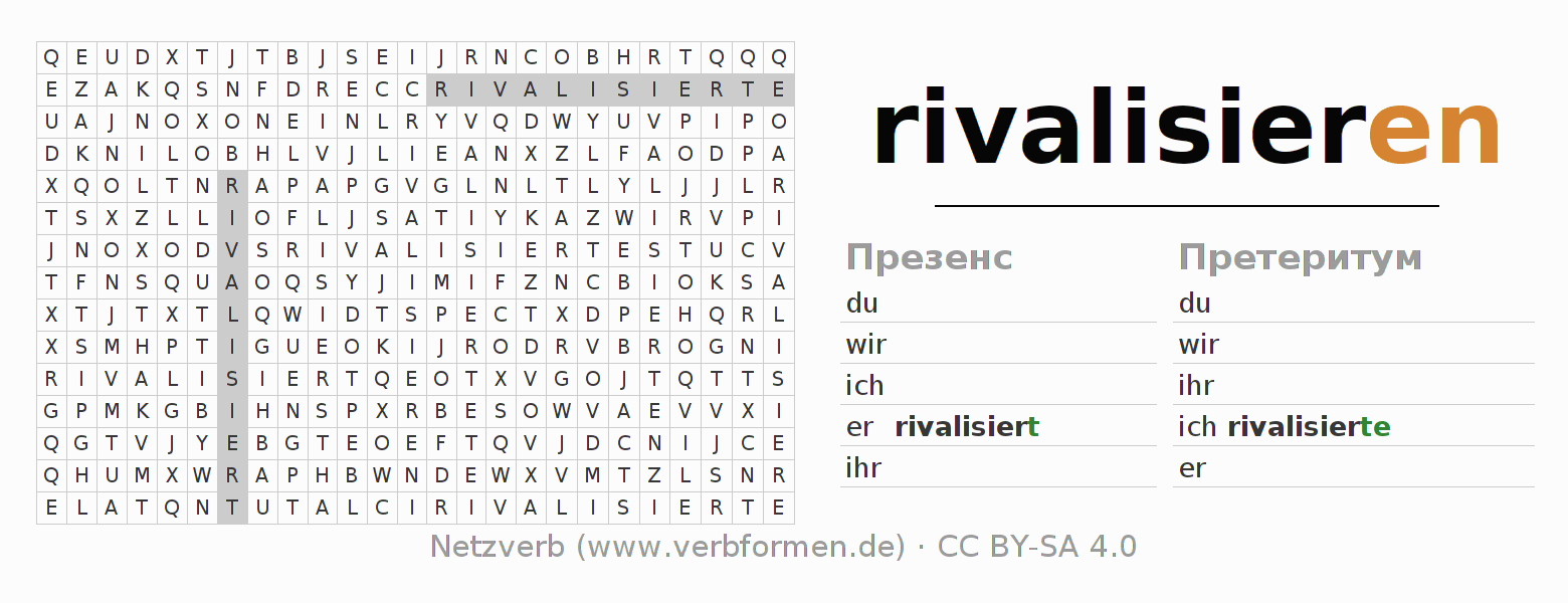 Инструкция: образовать формы глагола rivalisieren и найти их в головоломке, либо распознать изменённую форму rivalisieren в буквенном винегрете и соотнести ее с правильной формой глагола. Умлауты и -ß- транслитерируются соответственно как -oe-, -ae-, -ue- и -ss-.Ответ находится в конце страницы.