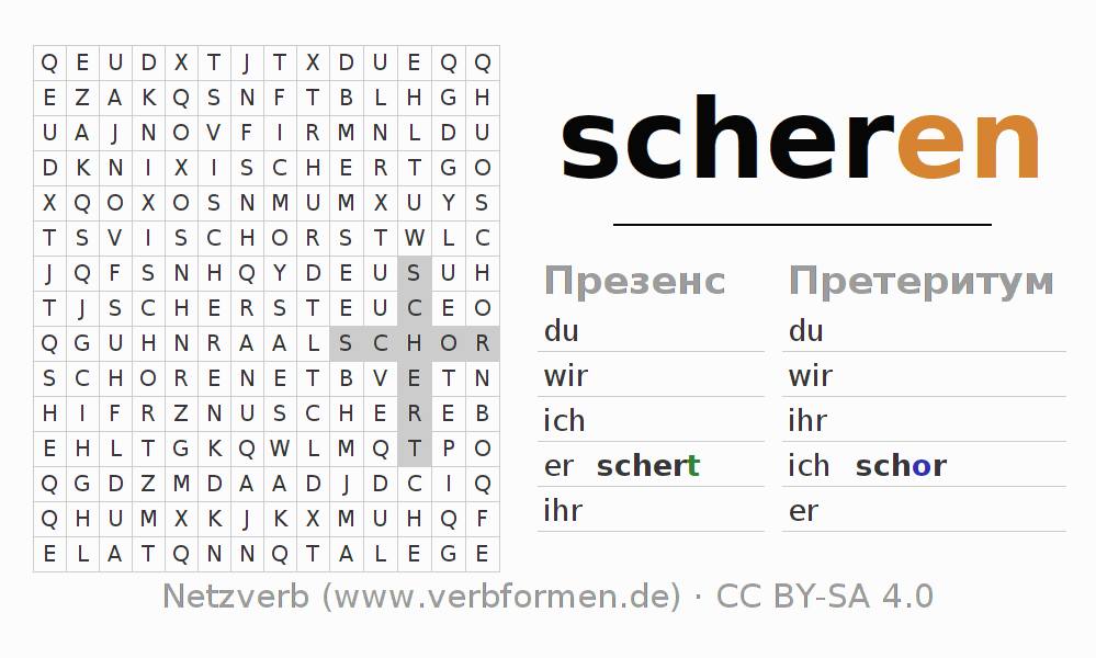 Инструкция: образовать формы глагола scheren и найти их в головоломке, либо распознать изменённую форму scheren в буквенном винегрете и соотнести ее с правильной формой глагола. Умлауты и -ß- транслитерируются соответственно как -oe-, -ae-, -ue- и -ss-.Ответ находится в конце страницы.