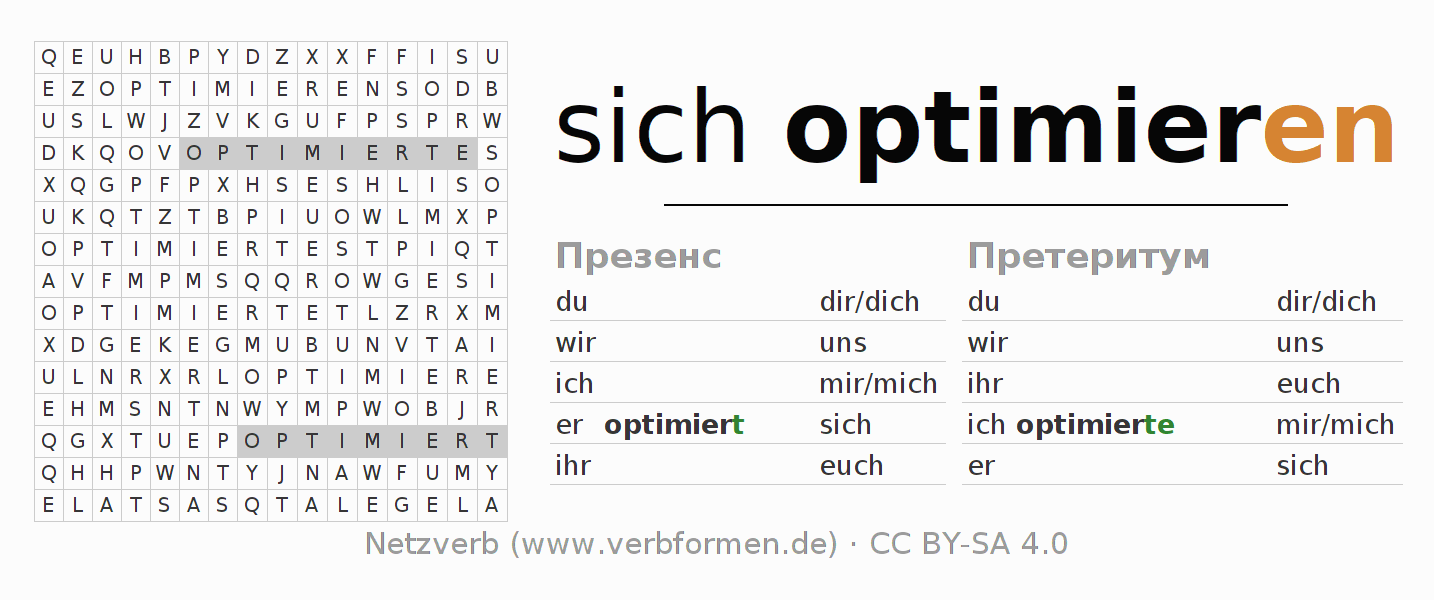 Инструкция: образовать формы глагола sich optimieren и найти их в головоломке, либо распознать изменённую форму sich optimieren в буквенном винегрете и соотнести ее с правильной формой глагола. Умлауты и -ß- транслитерируются соответственно как -oe-, -ae-, -ue- и -ss-.Ответ находится в конце страницы.