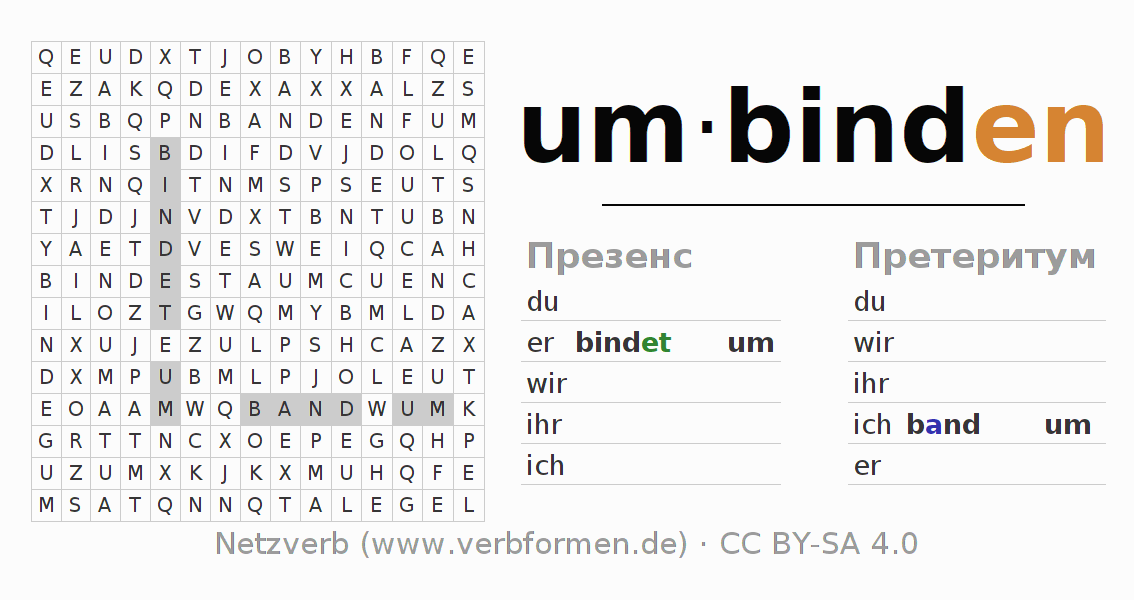 Инструкция: образовать формы глагола umbinden и найти их в головоломке, либо распознать изменённую форму umbinden в буквенном винегрете и соотнести ее с правильной формой глагола. Умлауты и -ß- транслитерируются соответственно как -oe-, -ae-, -ue- и -ss-.Ответ находится в конце страницы.