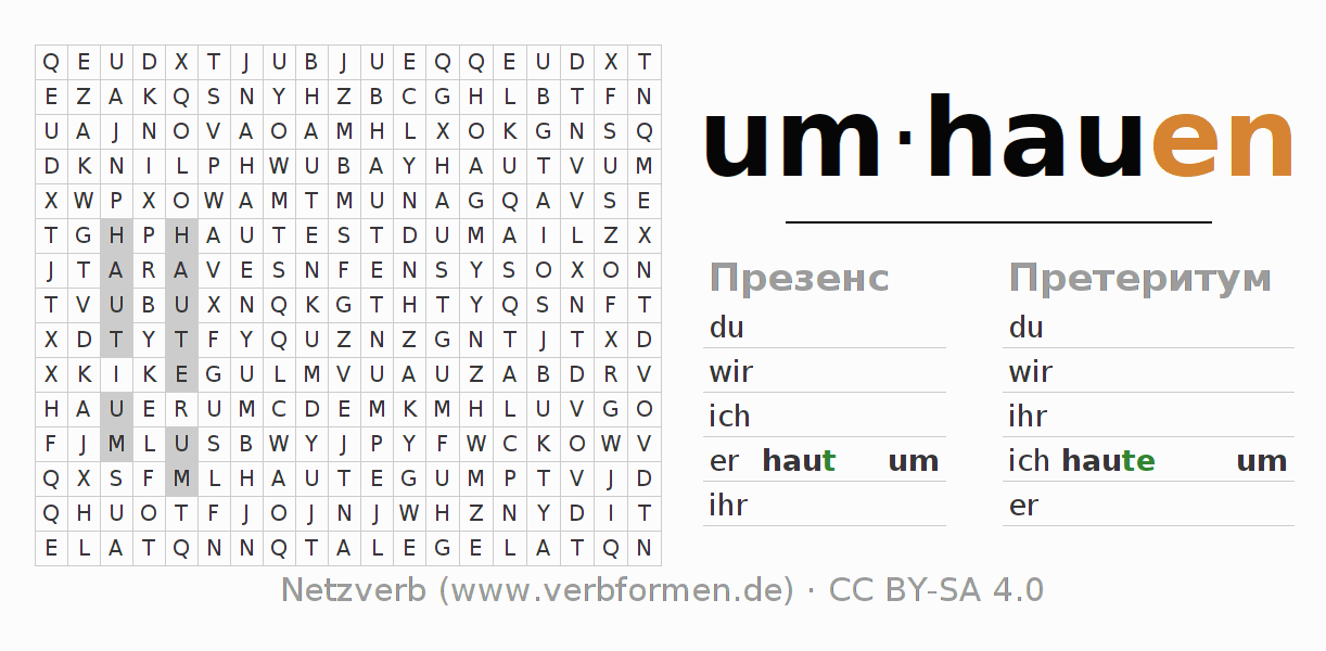 Инструкция: образовать формы глагола umhauen и найти их в головоломке, либо распознать изменённую форму umhauen в буквенном винегрете и соотнести ее с правильной формой глагола. Умлауты и -ß- транслитерируются соответственно как -oe-, -ae-, -ue- и -ss-.Ответ находится в конце страницы.