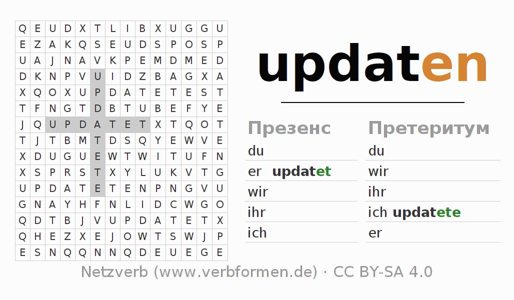 Инструкция: образовать формы глагола updaten и найти их в головоломке, либо распознать изменённую форму updaten в буквенном винегрете и соотнести ее с правильной формой глагола. Умлауты и -ß- транслитерируются соответственно как -oe-, -ae-, -ue- и -ss-.Ответ находится в конце страницы.
