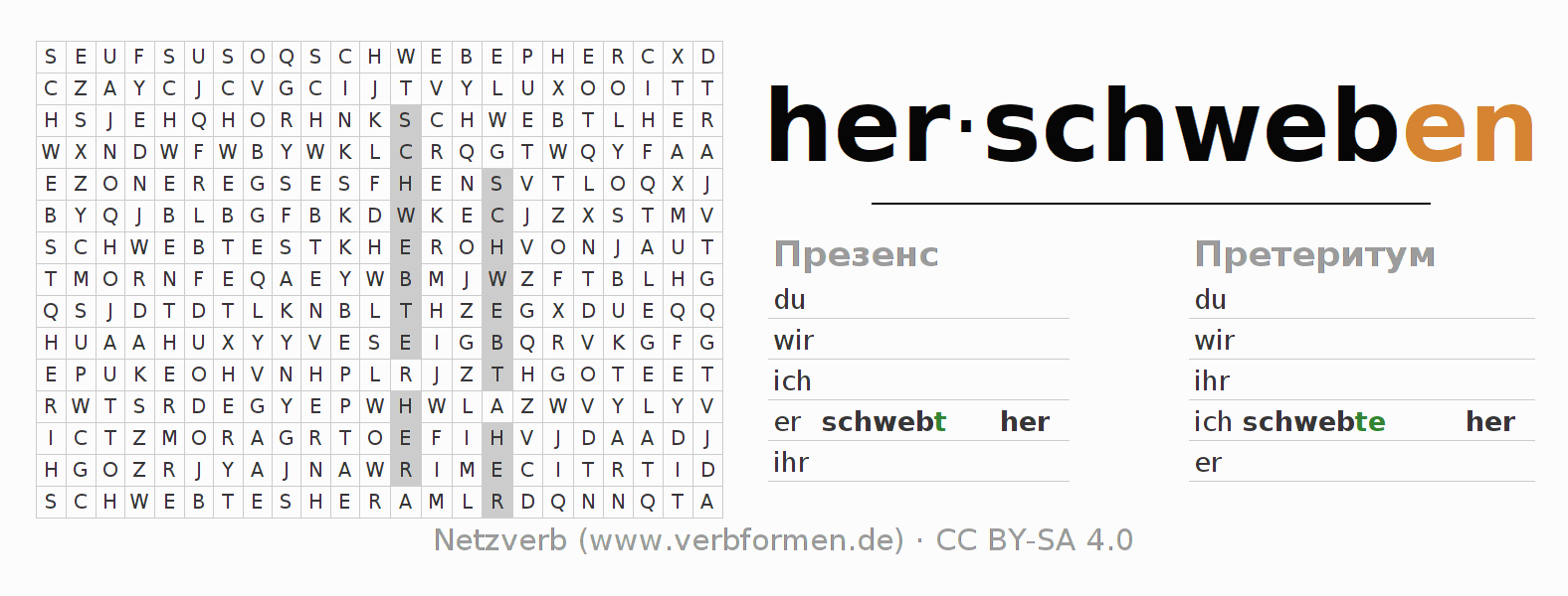 Инструкция: образовать формы глагола herschweben и найти их в головоломке, либо распознать изменённую форму herschweben в буквенном винегрете и соотнести ее с правильной формой глагола. Умлауты и -ß- транслитерируются соответственно как -oe-, -ae-, -ue- и -ss-.Ответ находится в конце страницы.