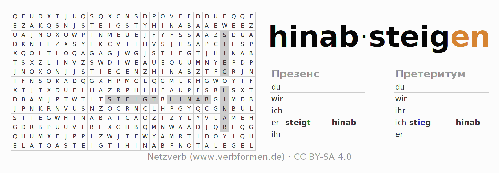 Инструкция: образовать формы глагола hinabsteigen и найти их в головоломке, либо распознать изменённую форму hinabsteigen в буквенном винегрете и соотнести ее с правильной формой глагола. Умлауты и -ß- транслитерируются соответственно как -oe-, -ae-, -ue- и -ss-.Ответ находится в конце страницы.