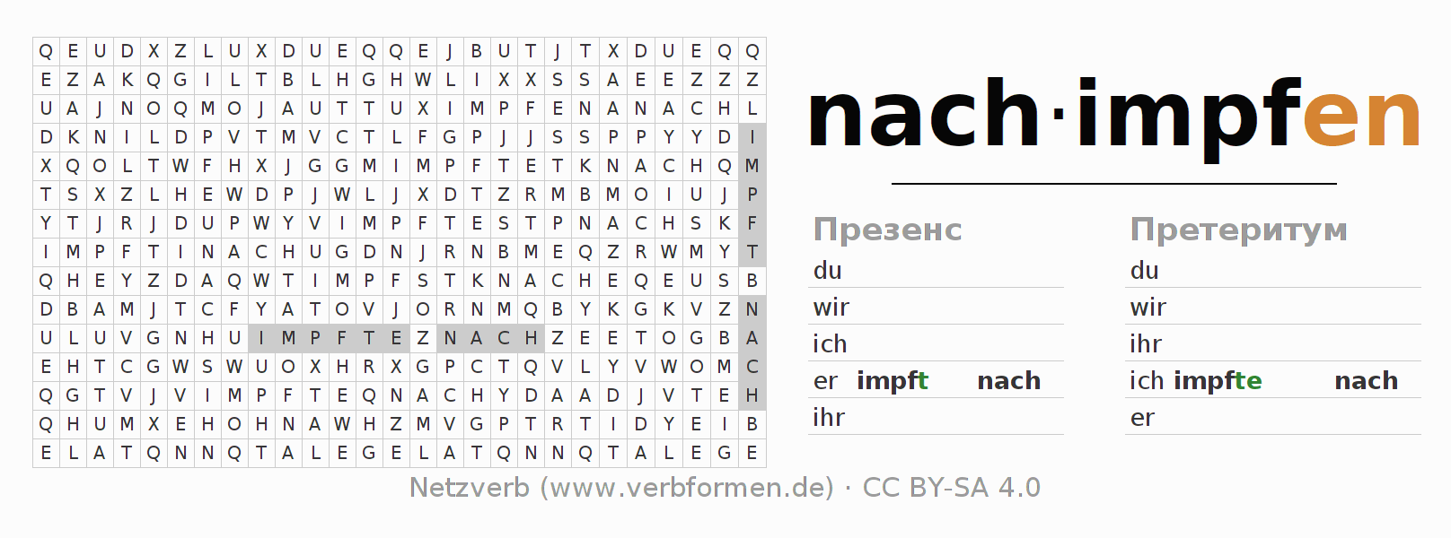 Инструкция: образовать формы глагола nachimpfen и найти их в головоломке, либо распознать изменённую форму nachimpfen в буквенном винегрете и соотнести ее с правильной формой глагола. Умлауты и -ß- транслитерируются соответственно как -oe-, -ae-, -ue- и -ss-.Ответ находится в конце страницы.