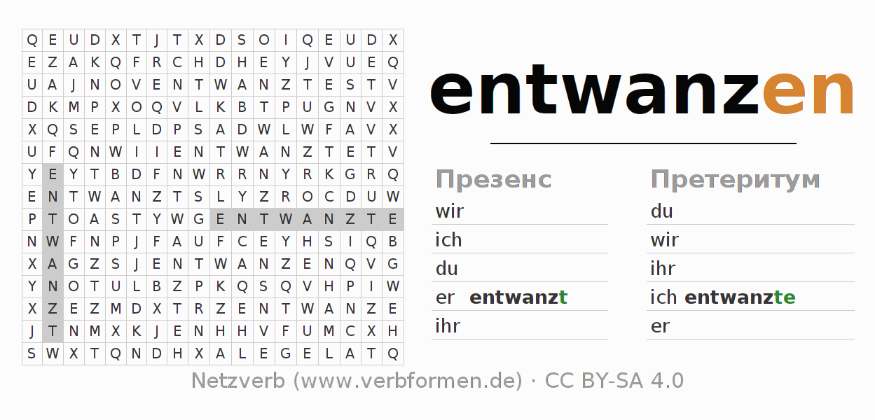 Инструкция: образовать формы глагола entwanzen и найти их в головоломке, либо распознать изменённую форму entwanzen в буквенном винегрете и соотнести ее с правильной формой глагола. Умлауты и -ß- транслитерируются соответственно как -oe-, -ae-, -ue- и -ss-.Ответ находится в конце страницы.