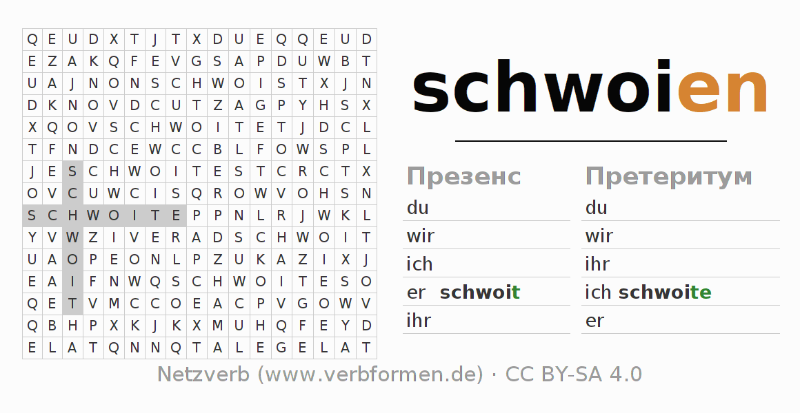 Инструкция: образовать формы глагола schwoien и найти их в головоломке, либо распознать изменённую форму schwoien в буквенном винегрете и соотнести ее с правильной формой глагола. Умлауты и -ß- транслитерируются соответственно как -oe-, -ae-, -ue- и -ss-.Ответ находится в конце страницы.