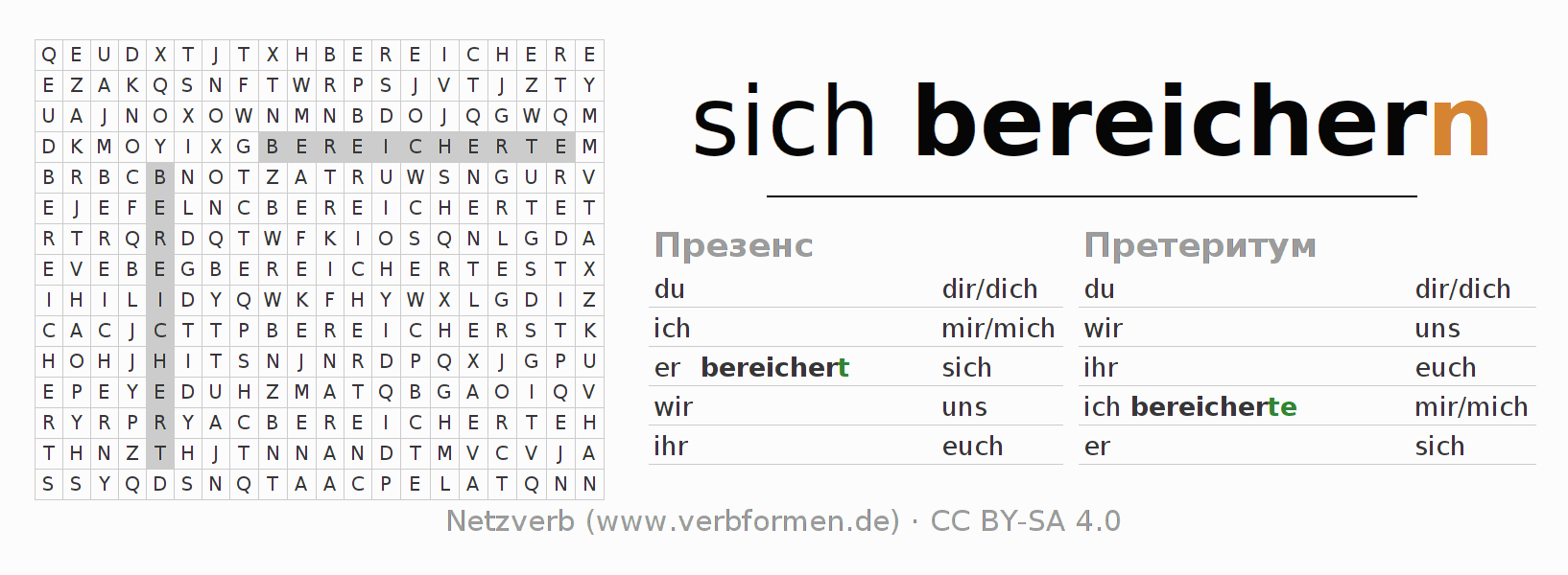 Инструкция: образовать формы глагола sich bereichern и найти их в головоломке, либо распознать изменённую форму sich bereichern в буквенном винегрете и соотнести ее с правильной формой глагола. Умлауты и -ß- транслитерируются соответственно как -oe-, -ae-, -ue- и -ss-.Ответ находится в конце страницы.