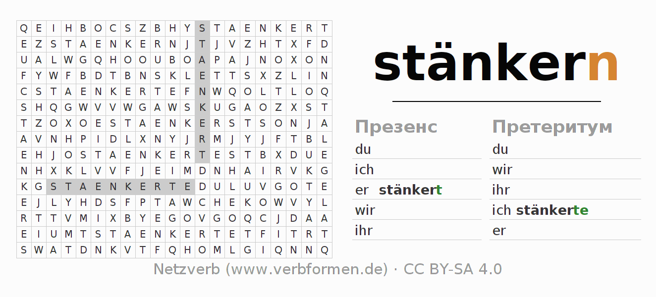 Инструкция: образовать формы глагола stänkern и найти их в головоломке, либо распознать изменённую форму stänkern в буквенном винегрете и соотнести ее с правильной формой глагола. Умлауты и -ß- транслитерируются соответственно как -oe-, -ae-, -ue- и -ss-.Ответ находится в конце страницы.