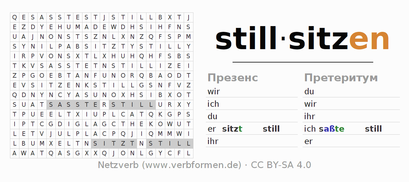 Инструкция: образовать формы глагола stillsitzen и найти их в головоломке, либо распознать изменённую форму stillsitzen в буквенном винегрете и соотнести ее с правильной формой глагола. Умлауты и -ß- транслитерируются соответственно как -oe-, -ae-, -ue- и -ss-.Ответ находится в конце страницы.