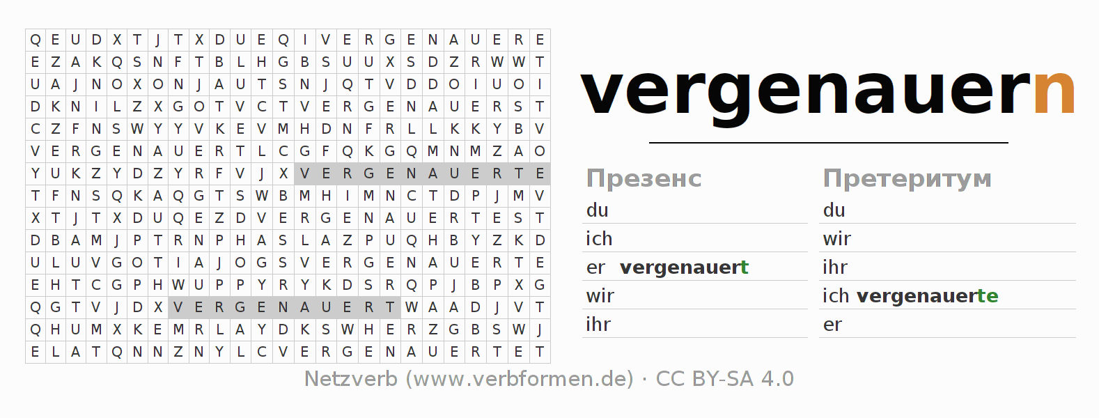 Инструкция: образовать формы глагола vergenauern и найти их в головоломке, либо распознать изменённую форму vergenauern в буквенном винегрете и соотнести ее с правильной формой глагола. Умлауты и -ß- транслитерируются соответственно как -oe-, -ae-, -ue- и -ss-.Ответ находится в конце страницы.