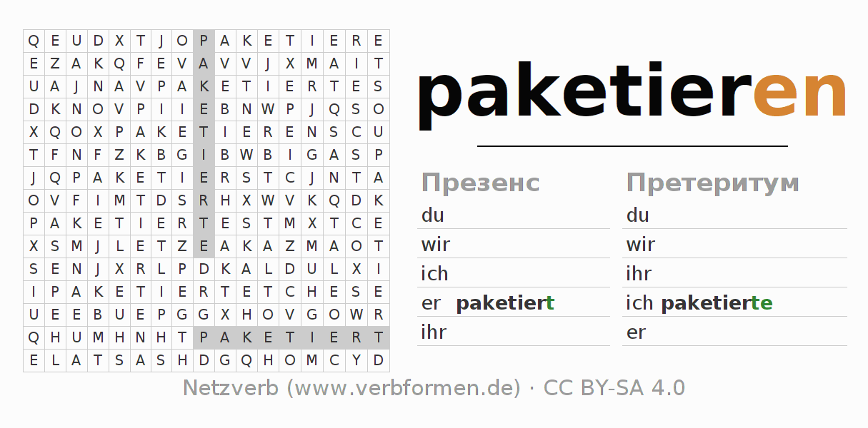 Инструкция: образовать формы глагола paketieren и найти их в головоломке, либо распознать изменённую форму paketieren в буквенном винегрете и соотнести ее с правильной формой глагола. Умлауты и -ß- транслитерируются соответственно как -oe-, -ae-, -ue- и -ss-.Ответ находится в конце страницы.