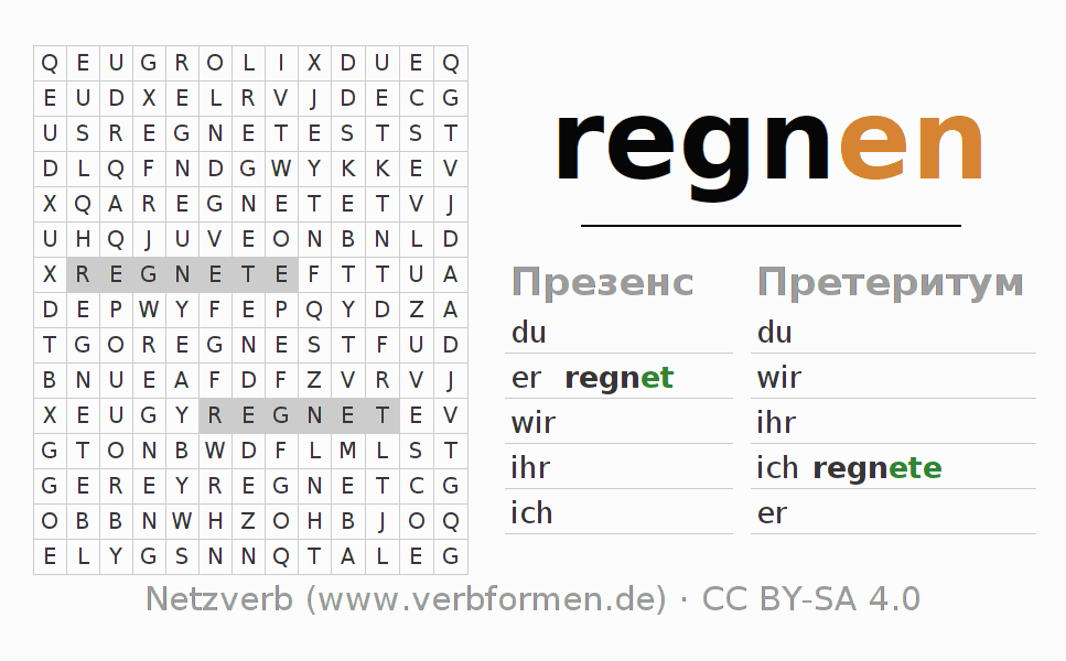 Инструкция: образовать формы глагола regnen и найти их в головоломке, либо распознать изменённую форму regnen в буквенном винегрете и соотнести ее с правильной формой глагола. Умлауты и -ß- транслитерируются соответственно как -oe-, -ae-, -ue- и -ss-.Ответ находится в конце страницы.