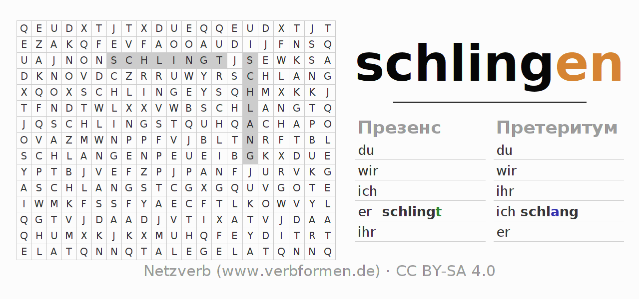 Инструкция: образовать формы глагола schlingen и найти их в головоломке, либо распознать изменённую форму schlingen в буквенном винегрете и соотнести ее с правильной формой глагола. Умлауты и -ß- транслитерируются соответственно как -oe-, -ae-, -ue- и -ss-.Ответ находится в конце страницы.