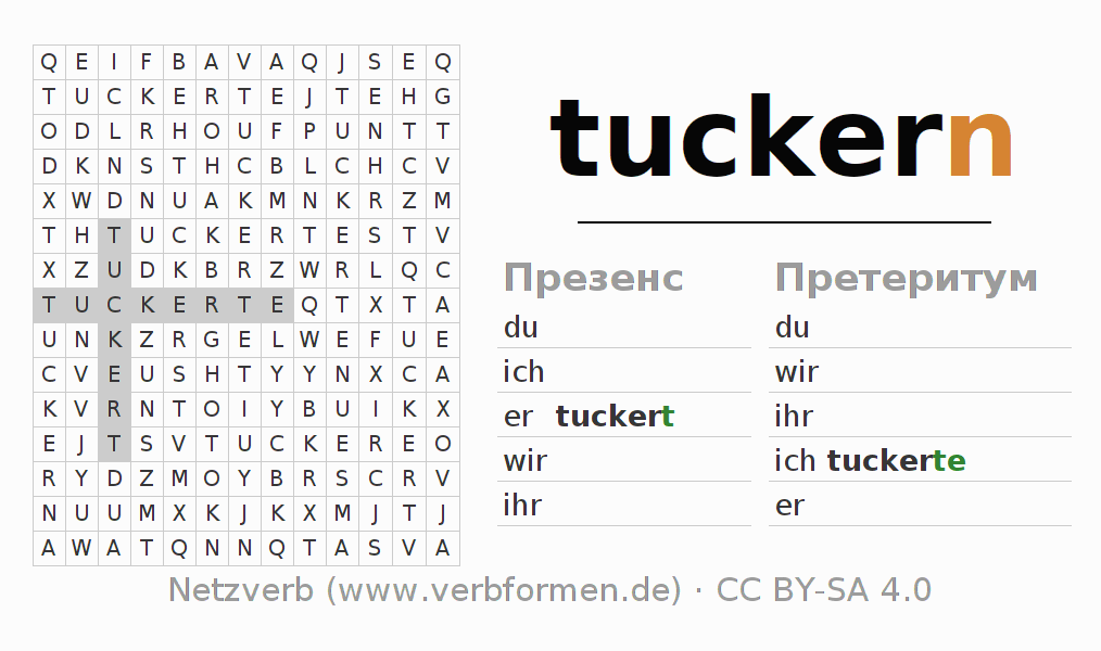 Инструкция: образовать формы глагола tuckern и найти их в головоломке, либо распознать изменённую форму tuckern в буквенном винегрете и соотнести ее с правильной формой глагола. Умлауты и -ß- транслитерируются соответственно как -oe-, -ae-, -ue- и -ss-.Ответ находится в конце страницы.