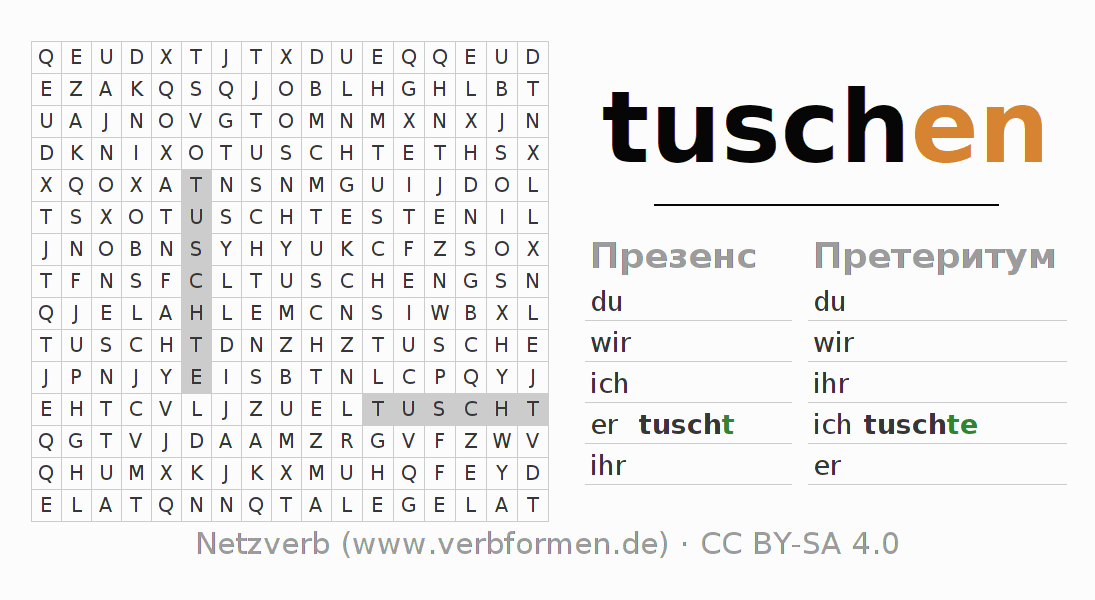 Инструкция: образовать формы глагола tuschen и найти их в головоломке, либо распознать изменённую форму tuschen в буквенном винегрете и соотнести ее с правильной формой глагола. Умлауты и -ß- транслитерируются соответственно как -oe-, -ae-, -ue- и -ss-.Ответ находится в конце страницы.