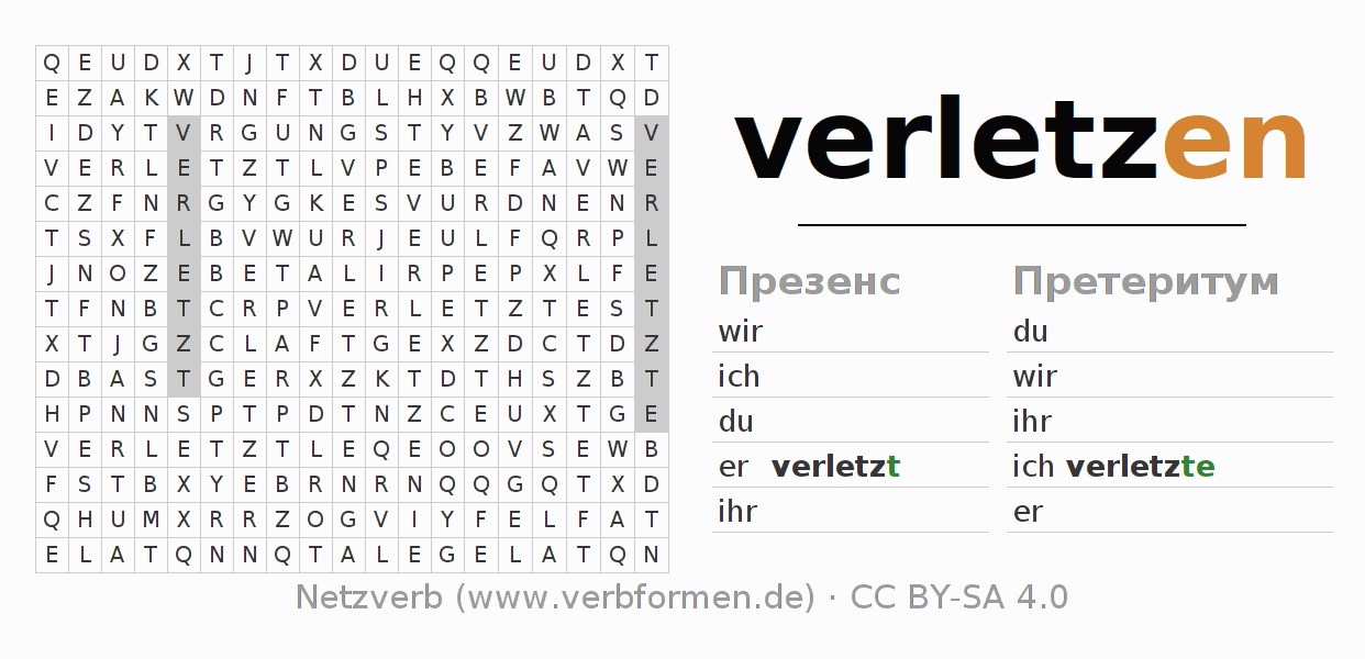 Инструкция: образовать формы глагола verletzen и найти их в головоломке, либо распознать изменённую форму verletzen в буквенном винегрете и соотнести ее с правильной формой глагола. Умлауты и -ß- транслитерируются соответственно как -oe-, -ae-, -ue- и -ss-.Ответ находится в конце страницы.