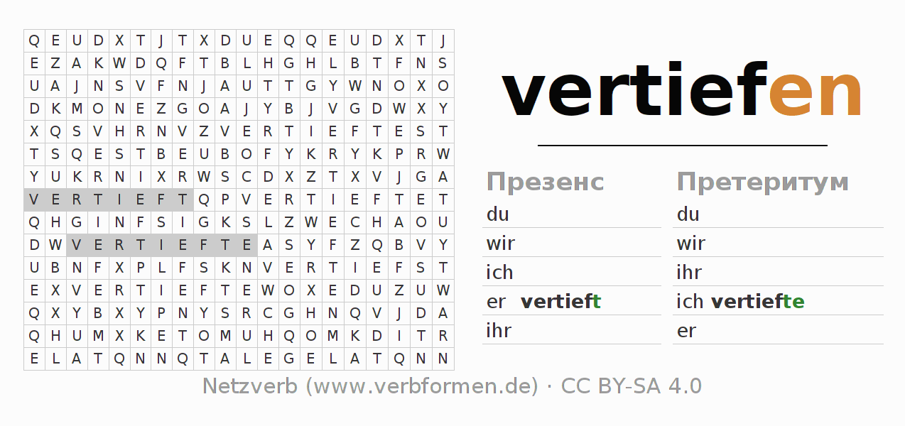 Инструкция: образовать формы глагола vertiefen и найти их в головоломке, либо распознать изменённую форму vertiefen в буквенном винегрете и соотнести ее с правильной формой глагола. Умлауты и -ß- транслитерируются соответственно как -oe-, -ae-, -ue- и -ss-.Ответ находится в конце страницы.