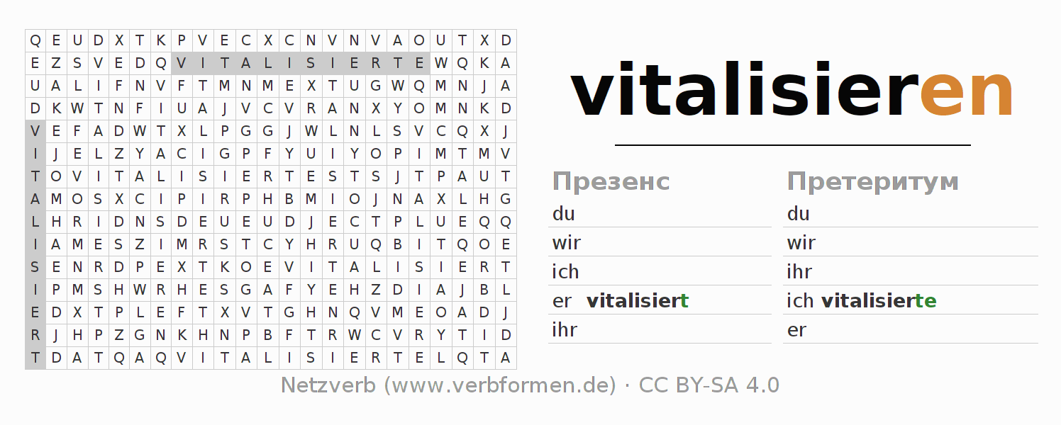 Инструкция: образовать формы глагола vitalisieren и найти их в головоломке, либо распознать изменённую форму vitalisieren в буквенном винегрете и соотнести ее с правильной формой глагола. Умлауты и -ß- транслитерируются соответственно как -oe-, -ae-, -ue- и -ss-.Ответ находится в конце страницы.