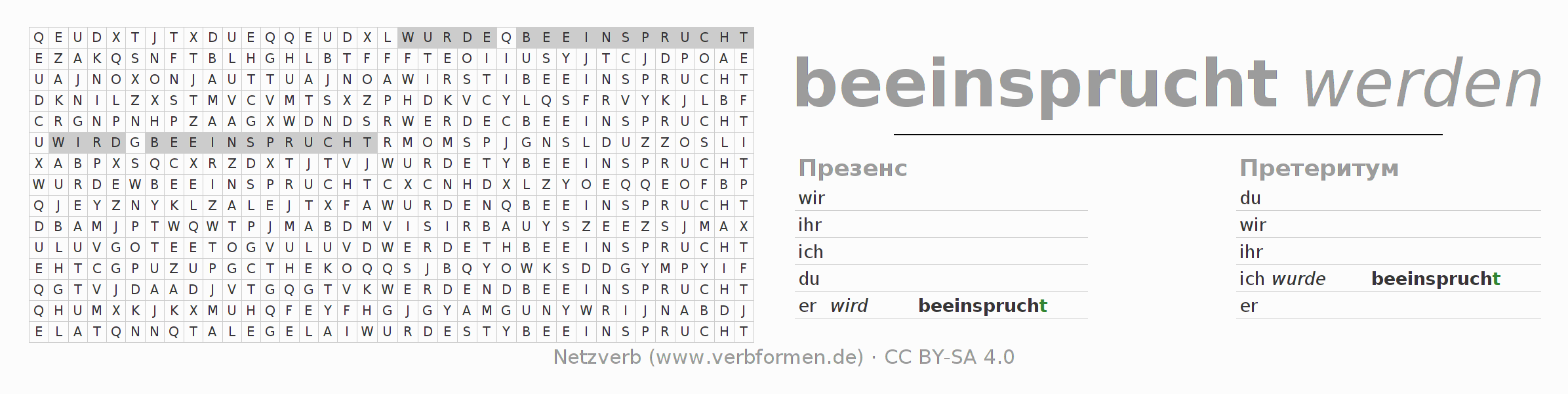 Инструкция: образовать формы глагола beeinspruchen и найти их в головоломке, либо распознать изменённую форму beeinspruchen в буквенном винегрете и соотнести ее с правильной формой глагола. Умлауты и -ß- транслитерируются соответственно как -oe-, -ae-, -ue- и -ss-.Ответ находится в конце страницы.