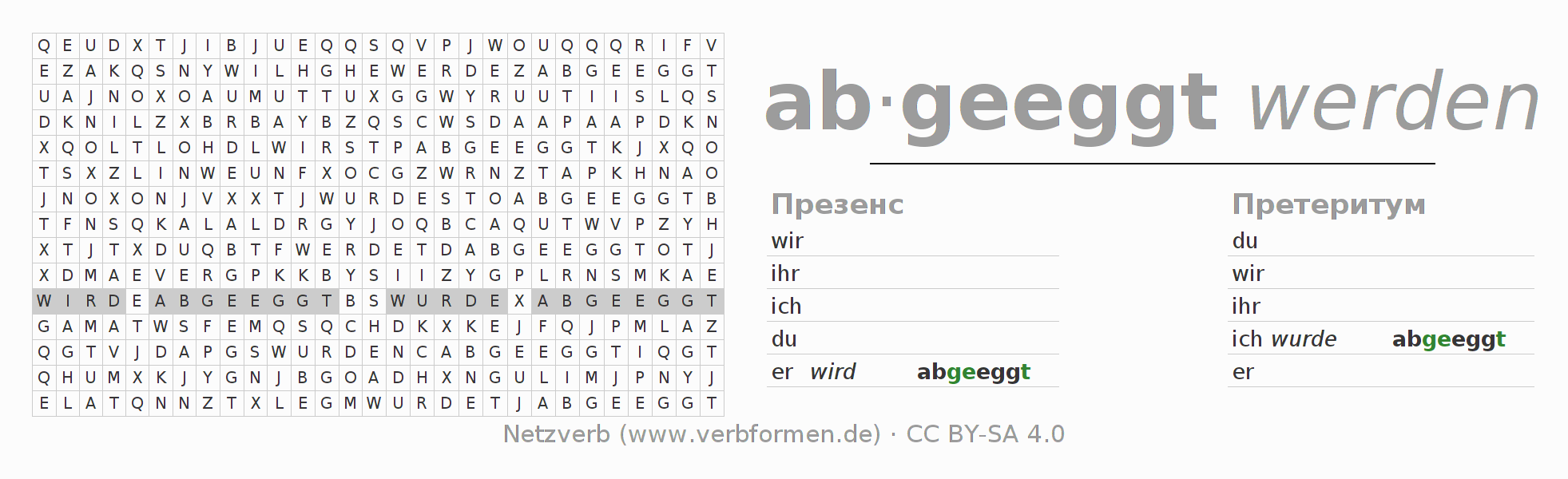 Инструкция: образовать формы глагола abeggen и найти их в головоломке, либо распознать изменённую форму abeggen в буквенном винегрете и соотнести ее с правильной формой глагола. Умлауты и -ß- транслитерируются соответственно как -oe-, -ae-, -ue- и -ss-.Ответ находится в конце страницы.
