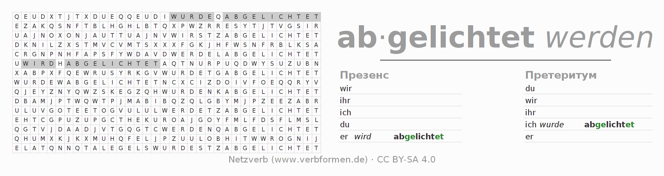 Инструкция: образовать формы глагола ablichten и найти их в головоломке, либо распознать изменённую форму ablichten в буквенном винегрете и соотнести ее с правильной формой глагола. Умлауты и -ß- транслитерируются соответственно как -oe-, -ae-, -ue- и -ss-.Ответ находится в конце страницы.