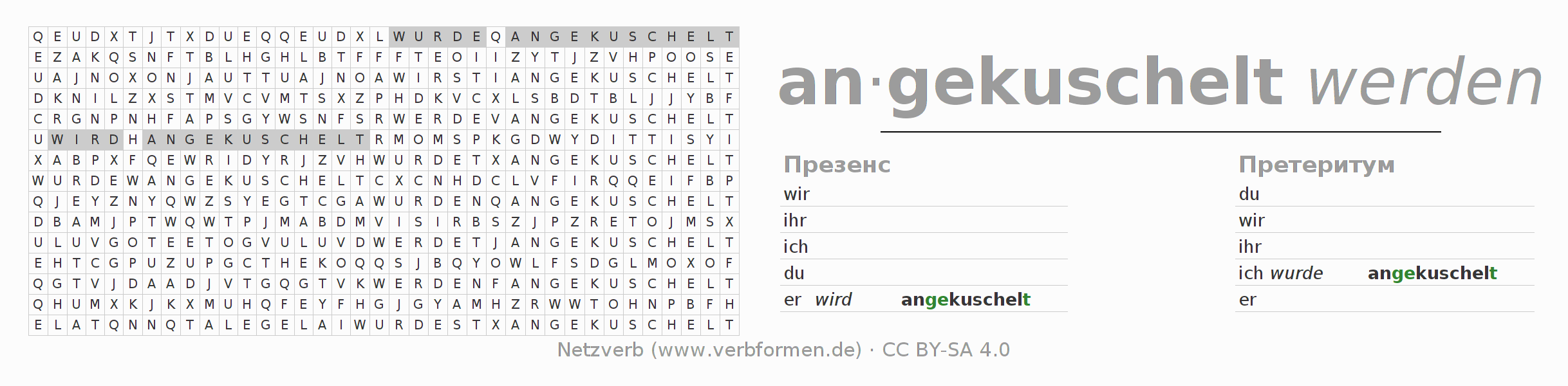 Инструкция: образовать формы глагола ankuscheln и найти их в головоломке, либо распознать изменённую форму ankuscheln в буквенном винегрете и соотнести ее с правильной формой глагола. Умлауты и -ß- транслитерируются соответственно как -oe-, -ae-, -ue- и -ss-.Ответ находится в конце страницы.