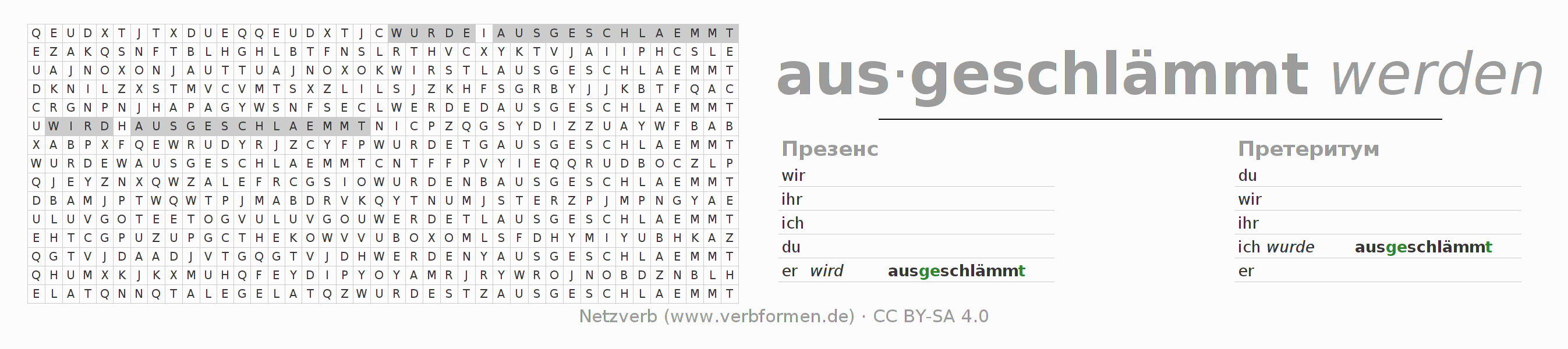 Инструкция: образовать формы глагола ausschlämmen и найти их в головоломке, либо распознать изменённую форму ausschlämmen в буквенном винегрете и соотнести ее с правильной формой глагола. Умлауты и -ß- транслитерируются соответственно как -oe-, -ae-, -ue- и -ss-.Ответ находится в конце страницы.