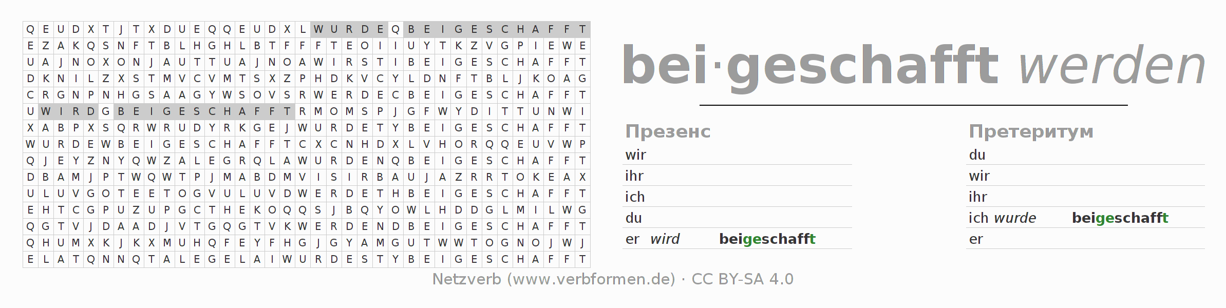 Инструкция: образовать формы глагола beischaffen и найти их в головоломке, либо распознать изменённую форму beischaffen в буквенном винегрете и соотнести ее с правильной формой глагола. Умлауты и -ß- транслитерируются соответственно как -oe-, -ae-, -ue- и -ss-.Ответ находится в конце страницы.
